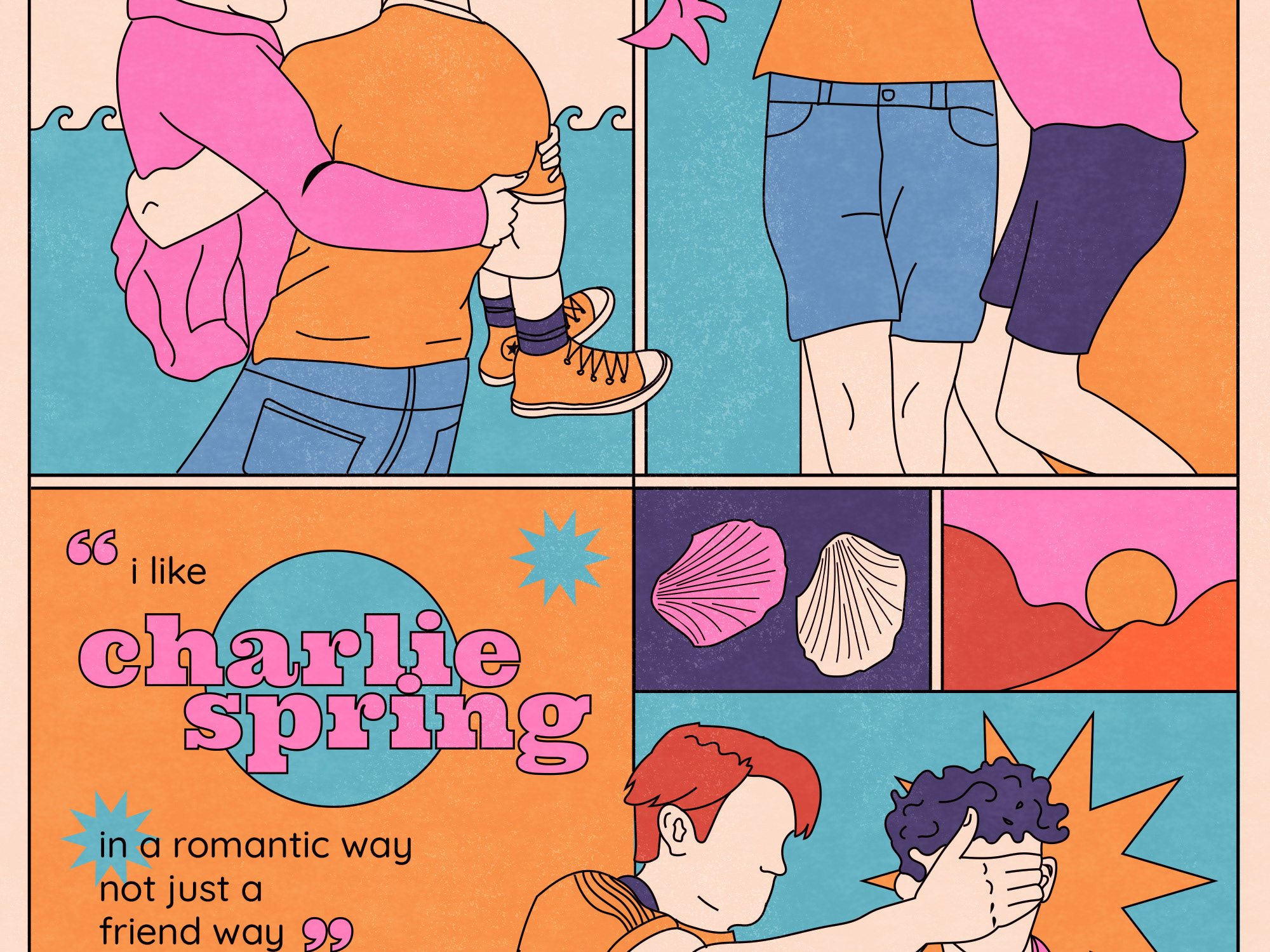 EN To design the illustration, I brought the 4 main characters of the plot set in a literally open room - a place where the elements of home and comfort mix with messes and imperfections. The color palette varies between sea green and blue, just like the gay pride flag, and the tones were chosen carefully so as not to look like a children's book. The choice of minimalist font and background color were inspired by Sally Rooney's covers, which is one of the author's references.